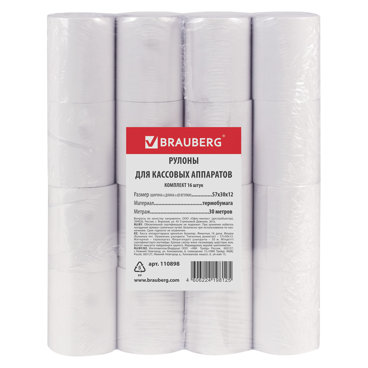 Чековая лента ТЕРМОБУМАГА 57 мм (диаметр 46 мм, длина 30 м, втулка 12 мм) КОМПЛЕКТ 16 шт., BRAUBERG, 110898