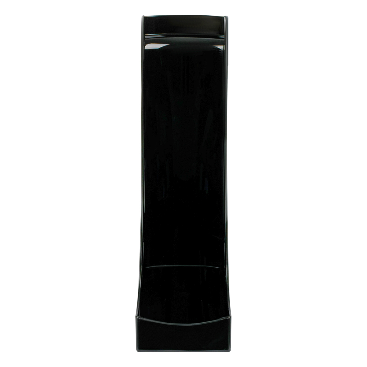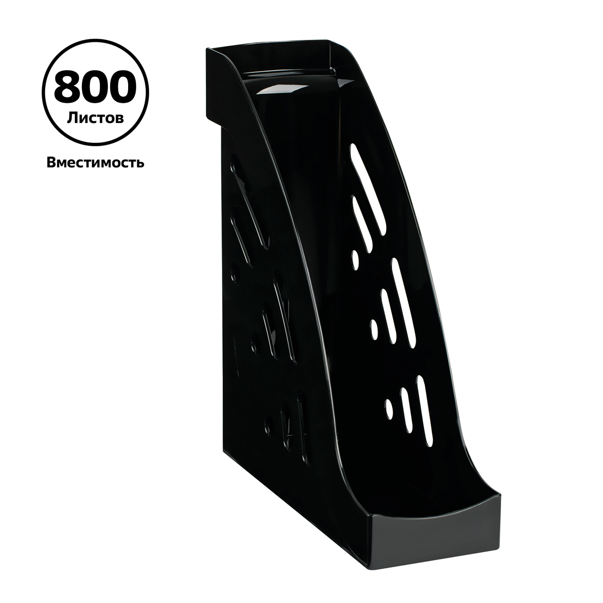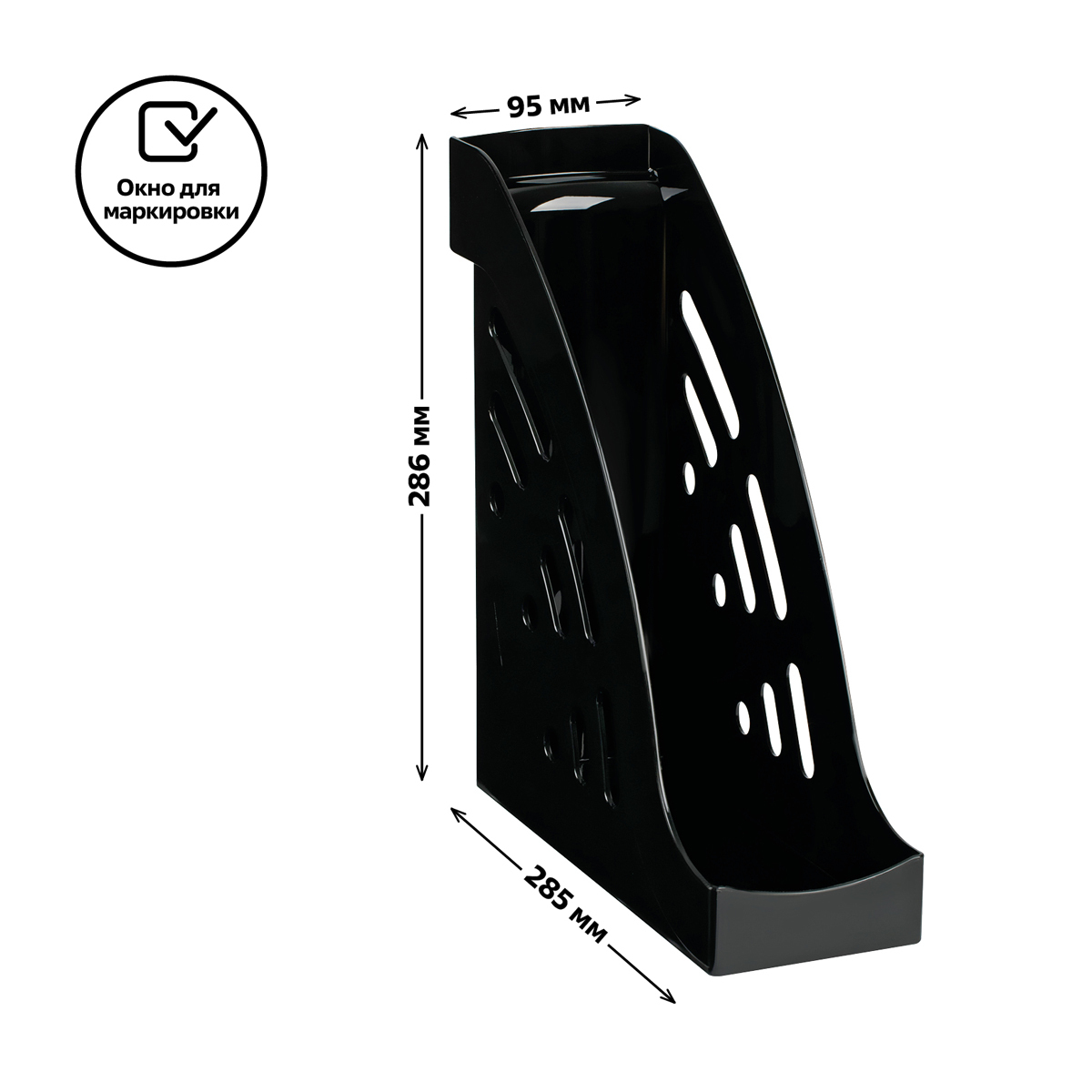 Вертикальный лоток для бумаг "СТАММ" серии "Эксперт" предназначен для хранения документов формата А4. Для удобного вытягивания с полки на торце предусмотрен захват, который также служит окном для маркировки с возможностью смены вкладышей. Изделие изготовлено из качественного пластика. Материал известен своей долговечностью, устойчивостью к ударам, поэтому лоток отличается надёжностью. Подходит для хранения тяжёлых каталогов и папок. Цвет лотка - черный. Лоток вмещает до 800 листов. Изделие высотой 286мм, глубина 285мм, шириной 95мм вмещает до 800 листов