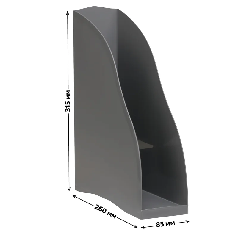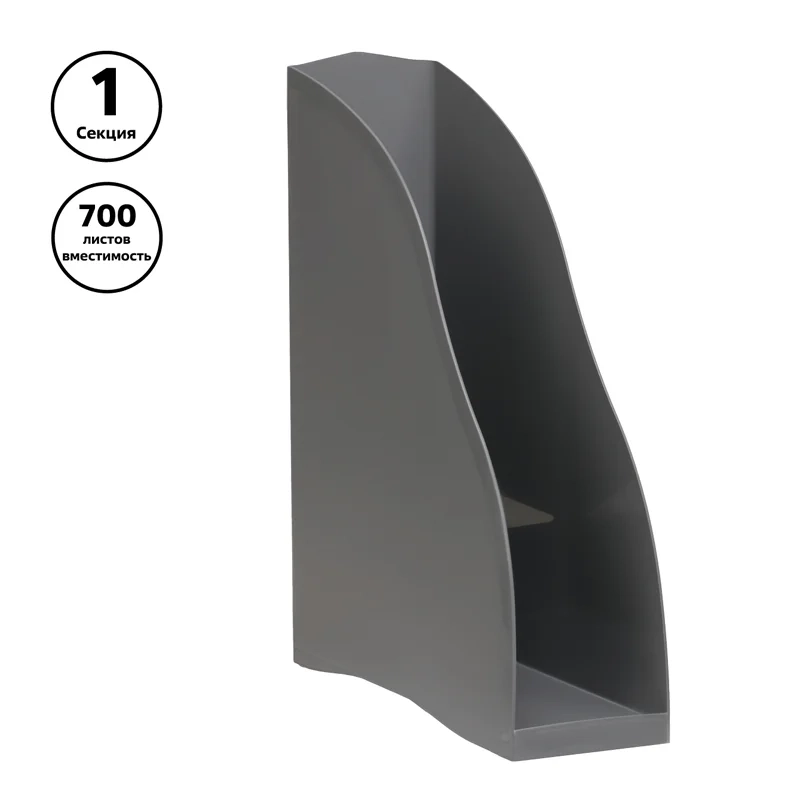 Лоток вертикальный для бумаг формата А4. Оригинальный дизайн, устойчивый, прочный корпус. Имеет комбинированную поверхность - глянцевую и матовую. На торцевой части предусмотрено отверстие для удобной переноски. Изготовлен из качественного полистирола. Цвет лотка - серый.