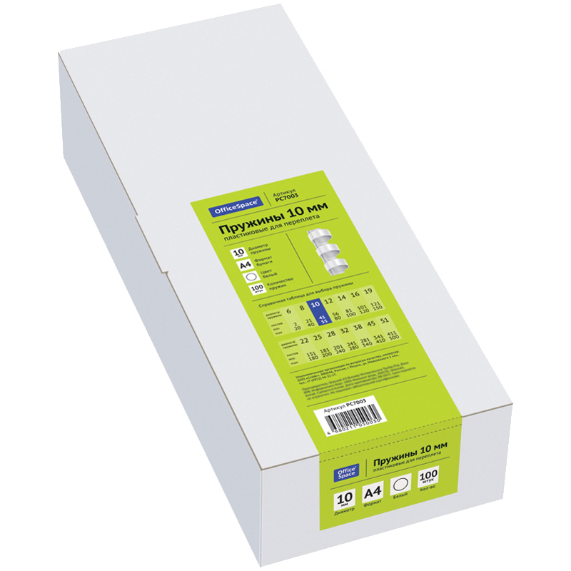 Пластиковые пружины OfficeSpace белого цвета диаметром 10мм предназначены для переплета документов. Легко выдерживают многократное раскрытие при необходимости добавить или удалить листы из готовой брошюры. Рекомендуемый объем брошюры при использовании данного диаметра пружины: 41-55 листов.