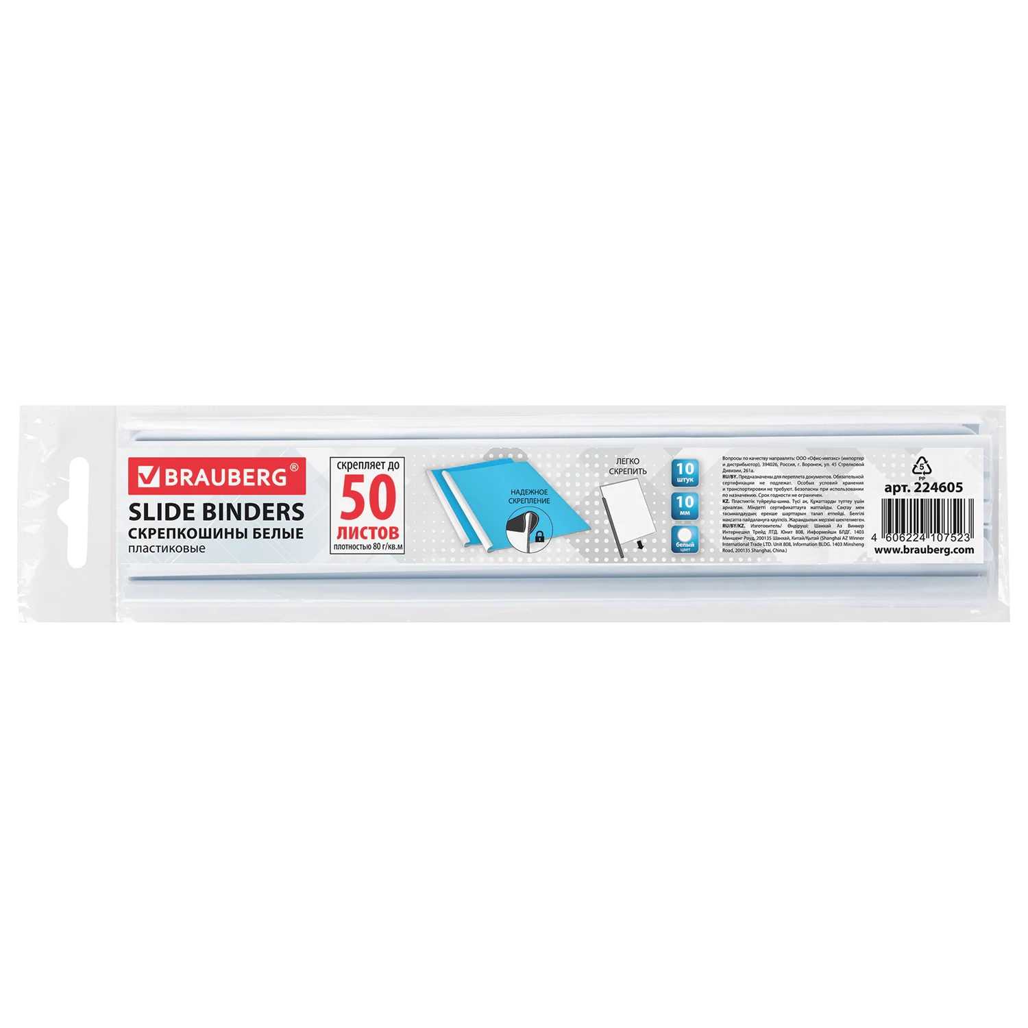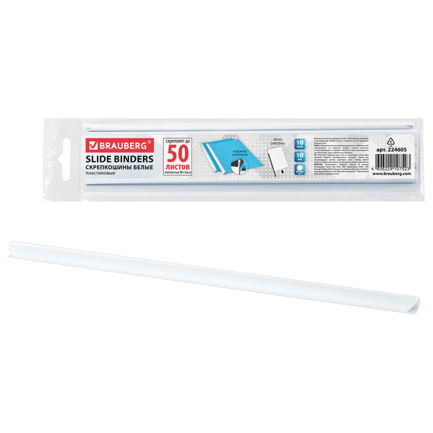 Скрепкошины для быстрого переплета BRAUBERG, комплект 10 шт., ширина 10 мм (до 50 л. А4), белые, 224605