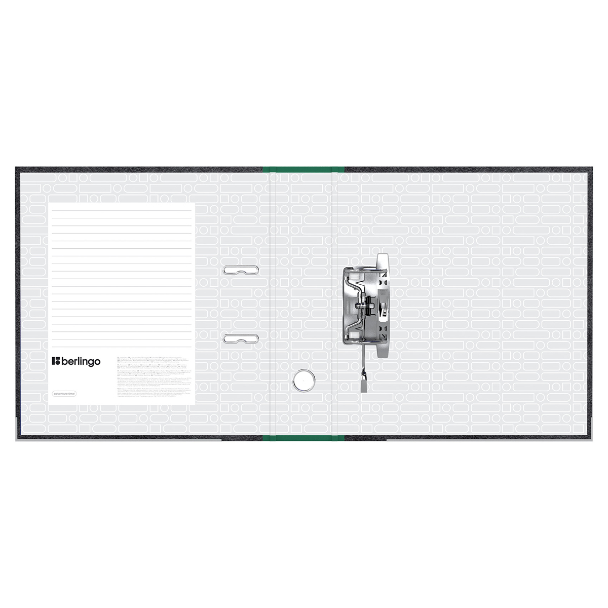 Папка-регистратор Berlingo серии Hyper формата А4 идеальна для создания архива. Папка размером 320*290*80 мм изготовлена из жёсткого износостойкого картона с односторонним покрытием из специальной ламинированной бумаги «под мрамор» и зелёным корешком. Папка эффективно экономит офисное пространство. Ширина корешка составляет 80 мм. Конструкция разработана с учётом всех особенностей эксплуатации. Выгодно отличается надёжным арочным механизмом из качественного металла, наличием кармана на корешке со сменным информационным ярлыком для маркировки, полем для записей на внутренней стороне обложки, отверстием для удобного снятия папки с полки. Для повышения износостойкости нижние грани укреплены металлическим кантом.