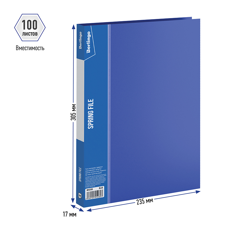 Папка с пружинным скоросшивателем Berlingo серии Standard размером 350*235*17 мм изготовлена из плотного пластика толщиной 0,7 мм с текстурой «песок». Вместимость папки – 100 листов, ширина корешка – 17 мм, на корешке имеется карман для сменной этикетки. Пружинный механизм надежно держит перфорированные документы и документы, помещенные в файлы-вкладыши. Дополнительный внутренний карман для бумажных мелочей. Папка выполнена в классическом синем цвете и предназначен для транспортировки и хранения бумаг, защищает их от пыли.