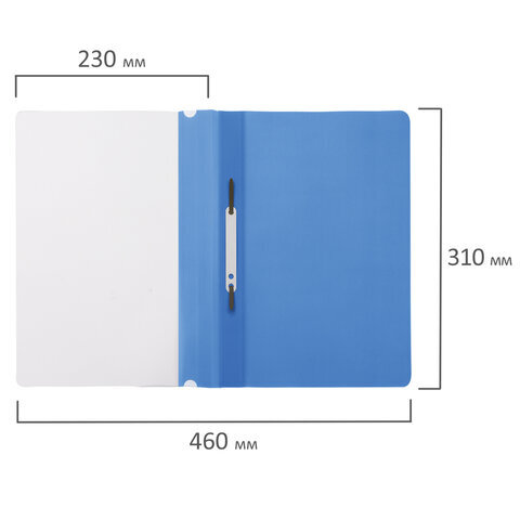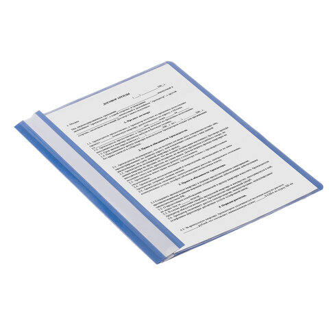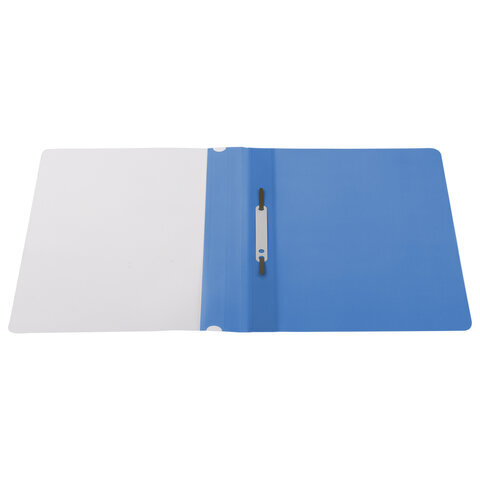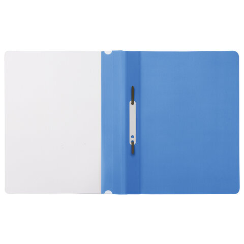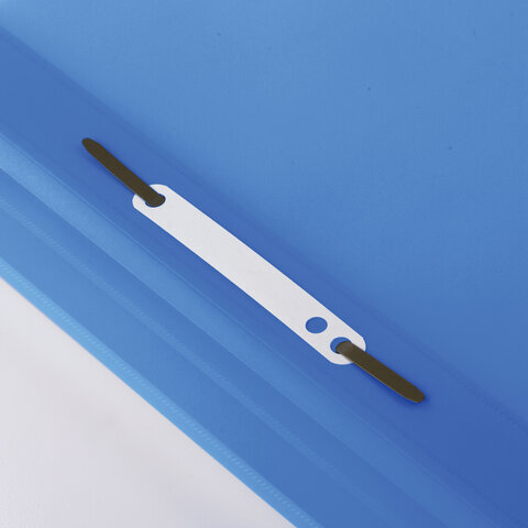 Фиксирует до 100 листов формата А4. Толщина пластика верхнего листа составляет 100 мкм, а нижнего - 120 мкм. Предельно простой механизм подшивки: металлические усики и пластиковая планка для надежной фиксации документов. Скоросшиватель изготовлен из качественного полипропилена. Прозрачный верхний лист позволяет определить содержимое, не открывая скоросшиватель, который к тому же снабжен сменным пластиковым корешком, что дает возможность структурировать информацию. Благодаря гладкой фактуре и яркому голубому цвету обложки папка никогда не затеряется на полке.