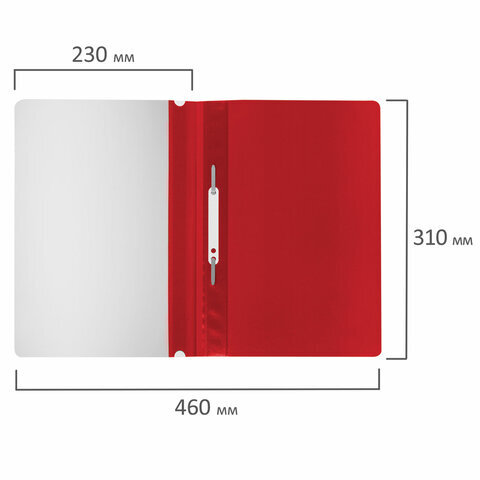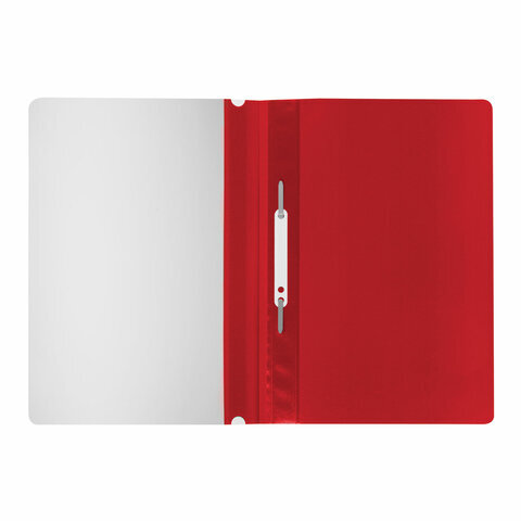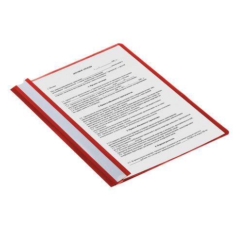 Фиксирует до 100 листов формата А4. Толщина пластика верхнего листа составляет 100 мкм, а нижнего - 120 мкм. Предельно простой механизм подшивки: металлические усики и пластиковая планка для надежной фиксации документов. Скоросшиватель изготовлен из качественного полипропилена. Прозрачный верхний лист позволяет определить содержимое, не открывая скоросшиватель, который к тому же снабжен сменным пластиковым корешком, что дает возможность структурировать информацию. Благодаря гладкой фактуре и яркому красному цвету обложки папка никогда не затеряется на полке.