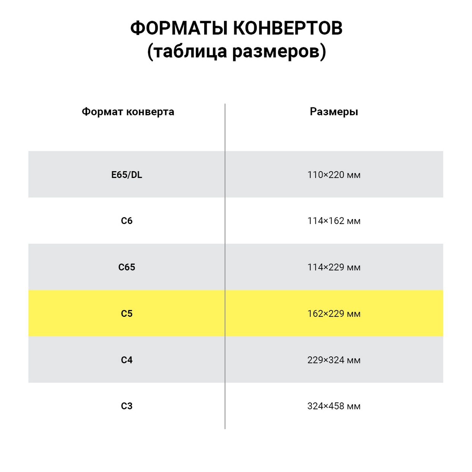Конверт почтовый формата С5 предназначен для рассылки писем, открыток, документов формата А5 или А4 в сложенном виде.