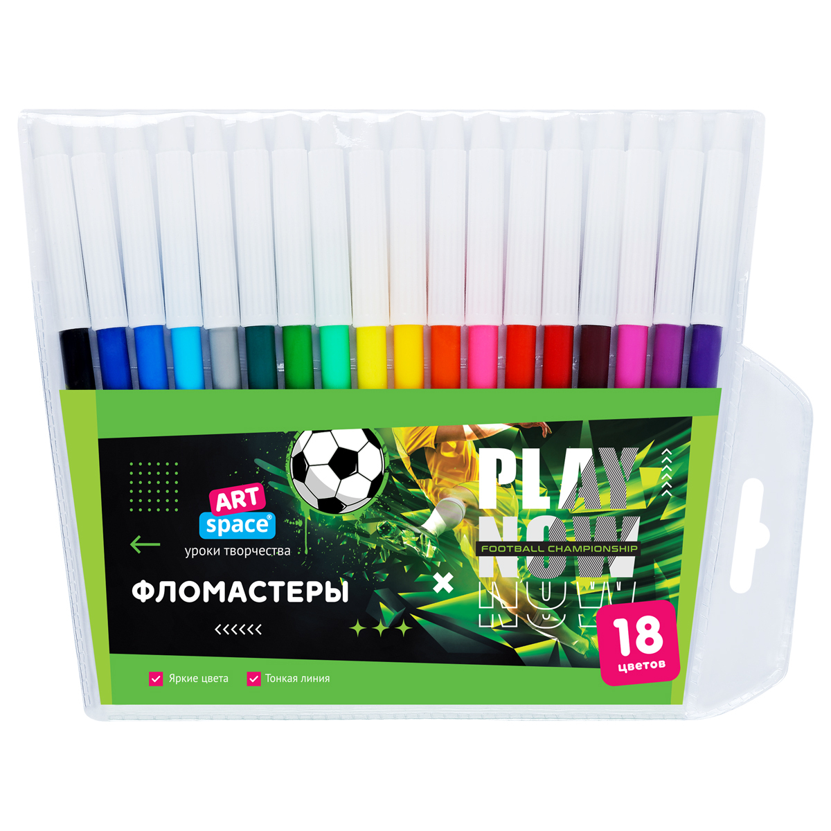 Фломастеры ArtSpace серии «Футбол» представлены с чернилами ярких цветов и невентилируемым колпачком белого цвета. Толщина линии письма составляет 1,0 мм. В наборе 18 ярких цветов. Тип наконечника – конический. Несмываемые фломастеры на водной основе нетоксичны. Набор фломастеров упакован в ПВХ-пакет с европодвесом и ярким вкладышем.