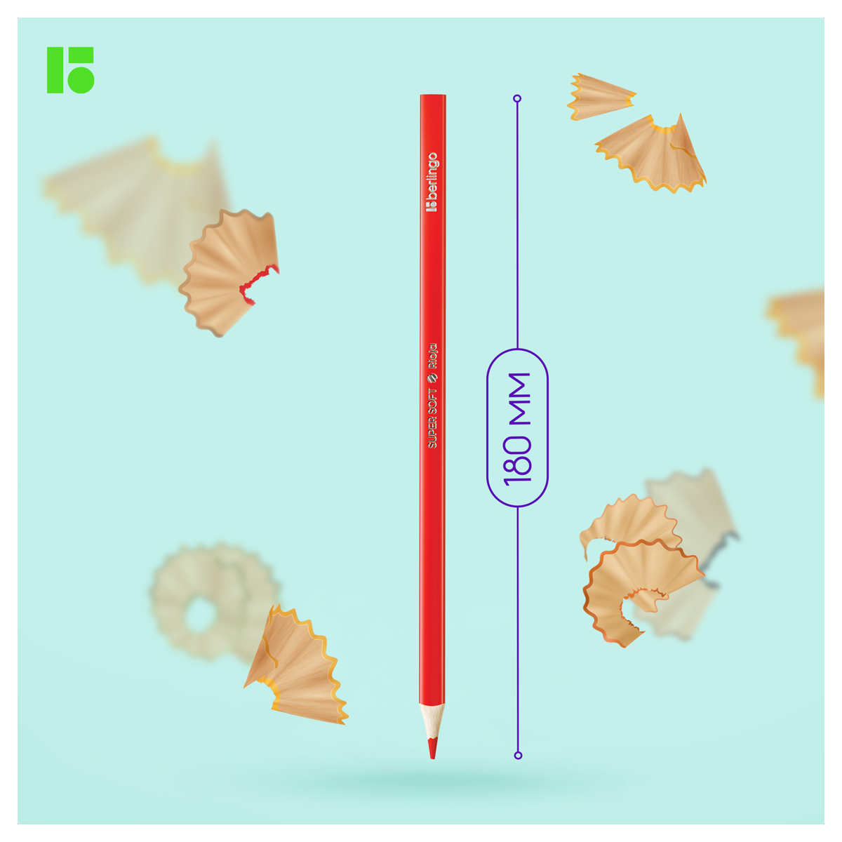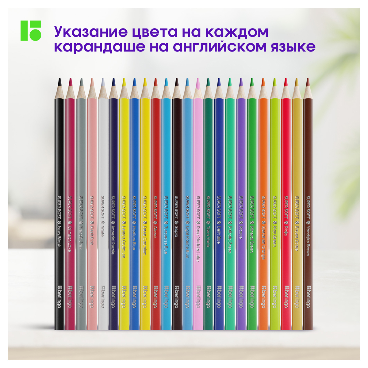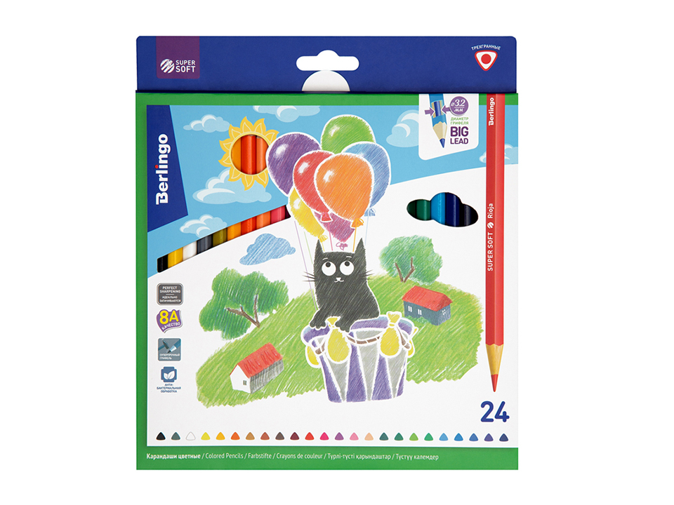 "SuperSoft" - линейка качественно новых цветных карандашей Berlingo. 24 цвета. Эргономичная трехгранная форма. Указание цвета на каждом карандаше на английском языке. Поле для подписи имени владельца на каждом карандаше. Упаковка в плотную матовую картонную коробку со склеенным европодвесом. Пластиковый трей внутри предотвращает скатывание карандашей и позволяет легко собирать их в коробку.