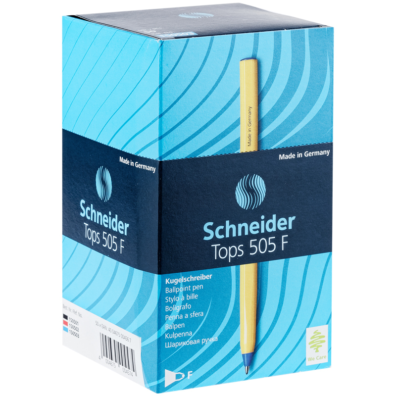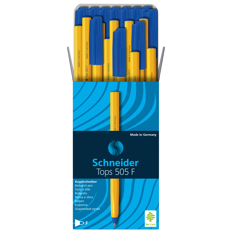 Набор шариковых ручек Schneider Tops 505 F в шестигранном оранжевом корпусе с синим колпачком под цвет чернил. Диаметр пишущего узла ручки составляет 0,8 мм, толщина линии письма – 0,4 мм. Длина линии письма - 4000 м. В упаковке 50 ручек. Письменные принадлежности Schneider разрабатываются и производятся только в Германии.