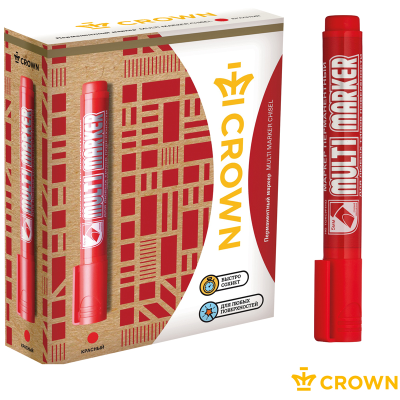 Перманентный маркер Crown "Multi Marker Chisel" - универсальное решение для маркировки на всех типах поверхностей: металл, дерево, резина, бетон/камень/кирпич, стекло, пленка, картон и др.