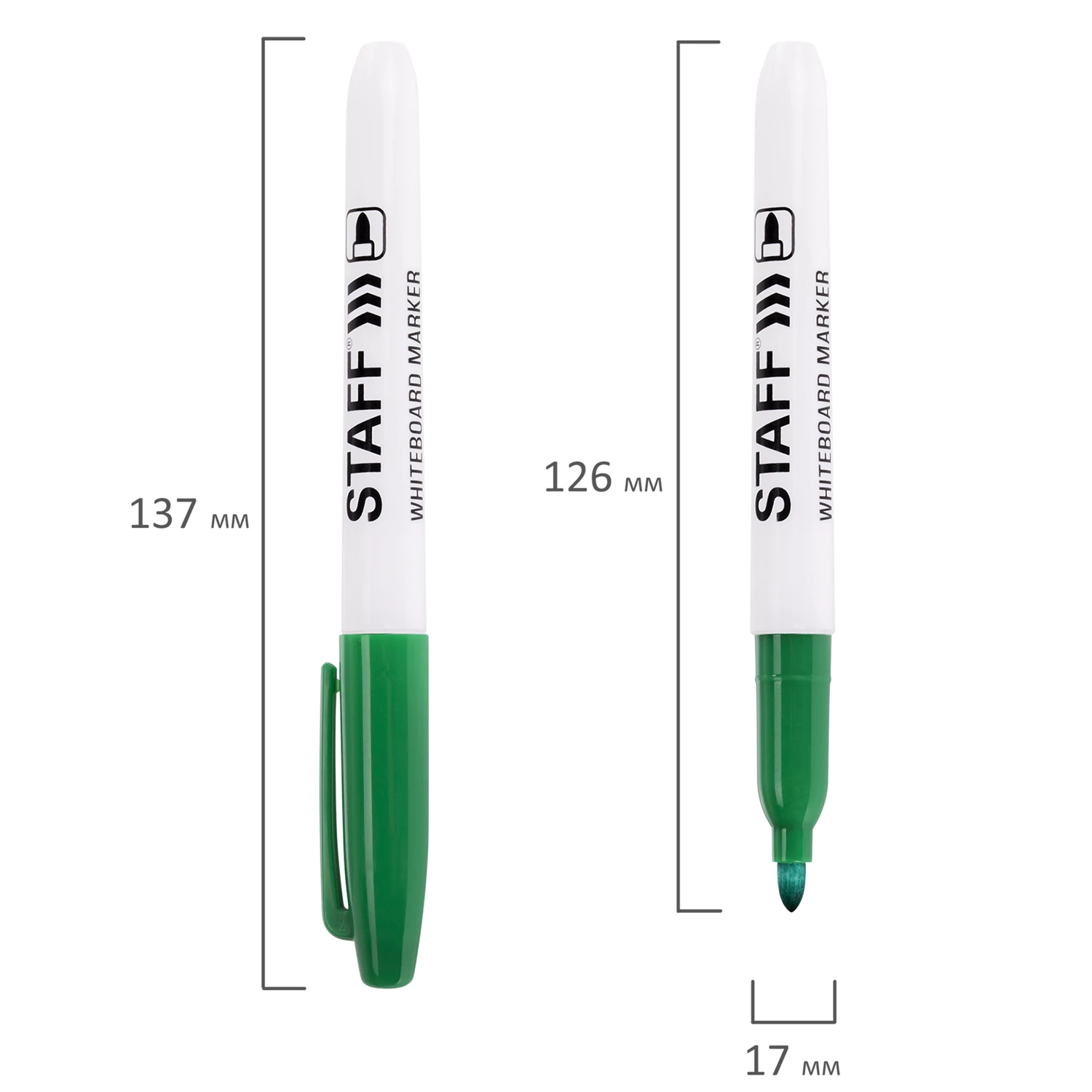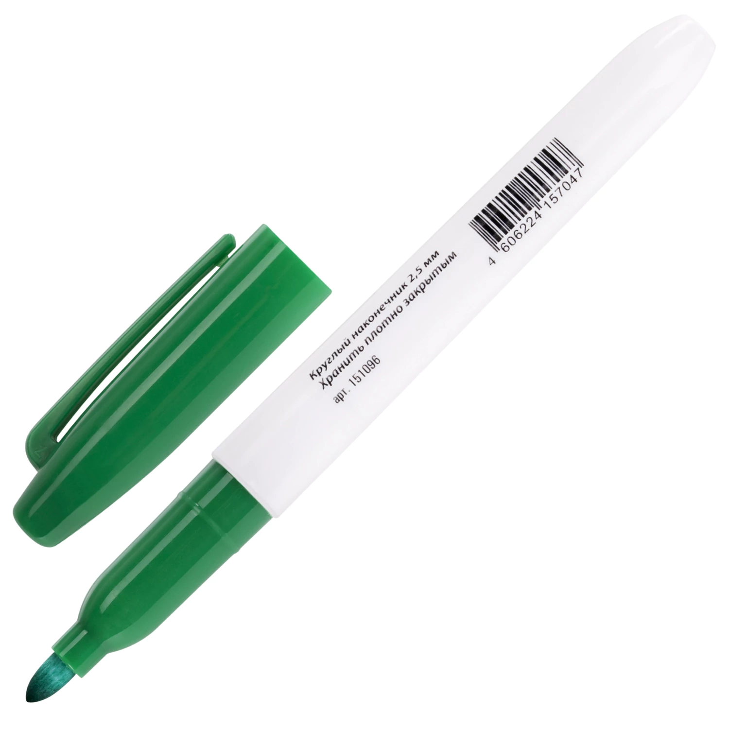 Маркер для доски зеленого цвета обладает круглым пластиковым корпусом диаметром 17 мм. Наконечник круглой формы обеспечивает толщину линии письма 2-5 мм в зависимости от угла наклона, что позволяет писать как мелким, так и крупным шрифтом. Благодаря спиртовой основе чернила быстро высыхают и не оставляют разводов, легко стираются сухой губкой. Изделие не перезаправляется. Цвет колпачка соответствует цвету чернил. Это товар эконом-сегмента, поэтому он отличается привлекательной ценой. Товар обладает базовым набором характеристик и простой упаковкой, при этом полностью соответствует основным требованиям потребителей.