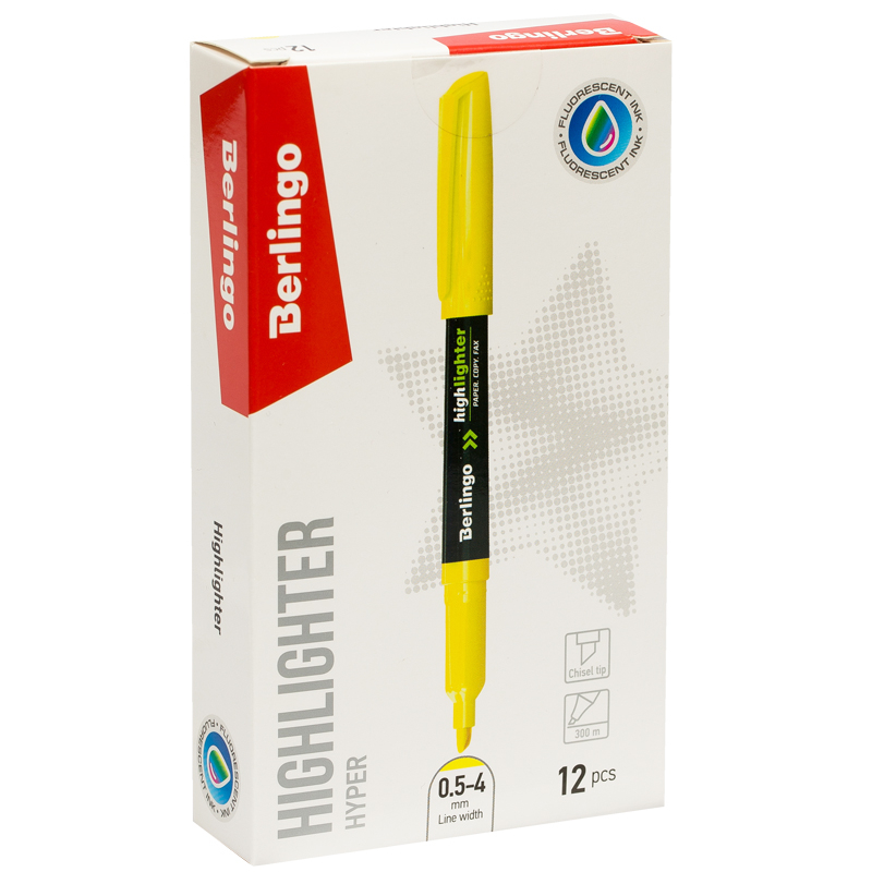 Текстовыделители с флуоресцентными чернилами на водной основе. Длина непрерывной линии до 300 метров. Толщина линии от 0,5 до 4 мм. Удобный тонкий корпус. Цвет колпачка и торцевого элемента соответствует цвету чернил. Упаковка в картонную коробку по 12 шт. (одного цвета)