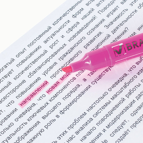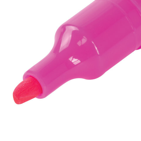 Текстовыделитель розового цвета обладает круглой формой корпуса диаметром 14 мм. Скошенный наконечник имеет толщину линии письма от 1 до 3 мм, что обеспечивает удобство при работе с текстом, напечатанным мелким шрифтом, или таблицами. Текстовыделитель обладает экономным расходом чернил. Светоустойчивые чернила на водной основе не выцветают даже на открытом солнце и не размазываются в процессе использования. Изделие не перезаправляется. Цвет колпачка и корпуса соответствует цвету чернил.