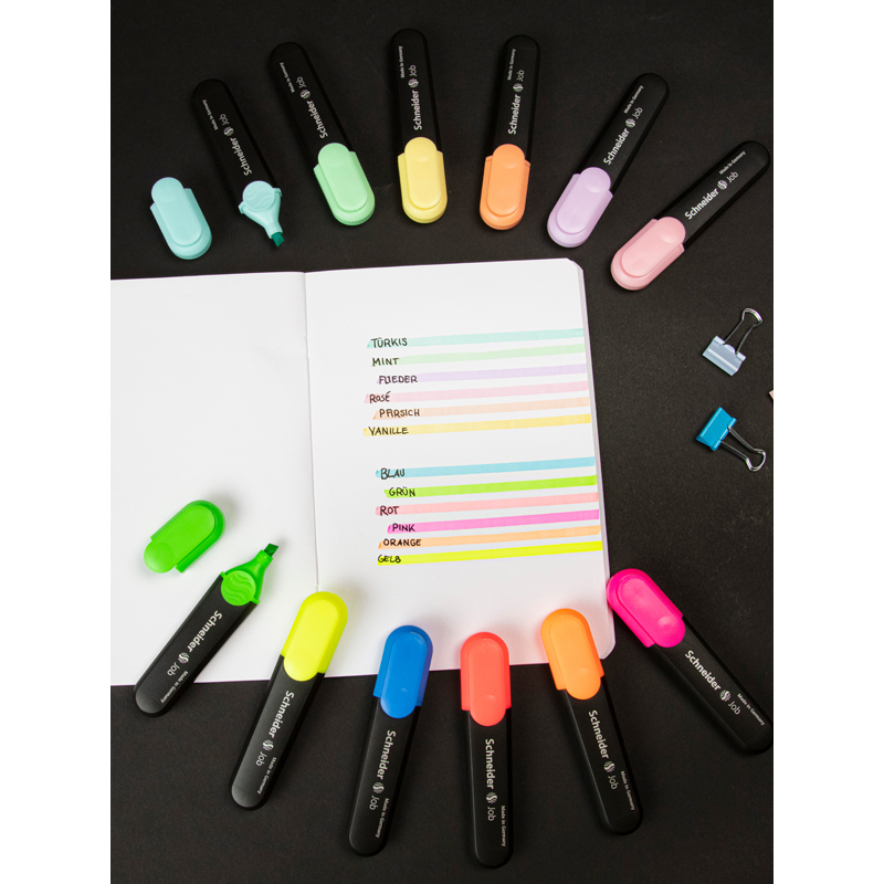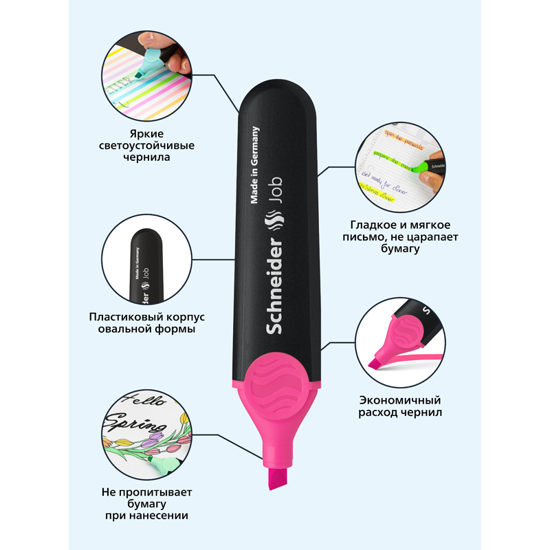 Универсальный текстовыделитель Schneider Job имеет светостойкие чернила яркого неонового розового цвета на водной основе. Толщина линии варьируется от 1 до 5 мм. Упаковка: картонная коробка по 10 штук. Schneider Job подходит для различных типов бумаги. Текстовыделитель представлен со скошенным наконечником. Диаметр овального пластикового корпуса составляет 24 мм. Цвет колпачка и элементов корпуса соответствует цвету чернил.