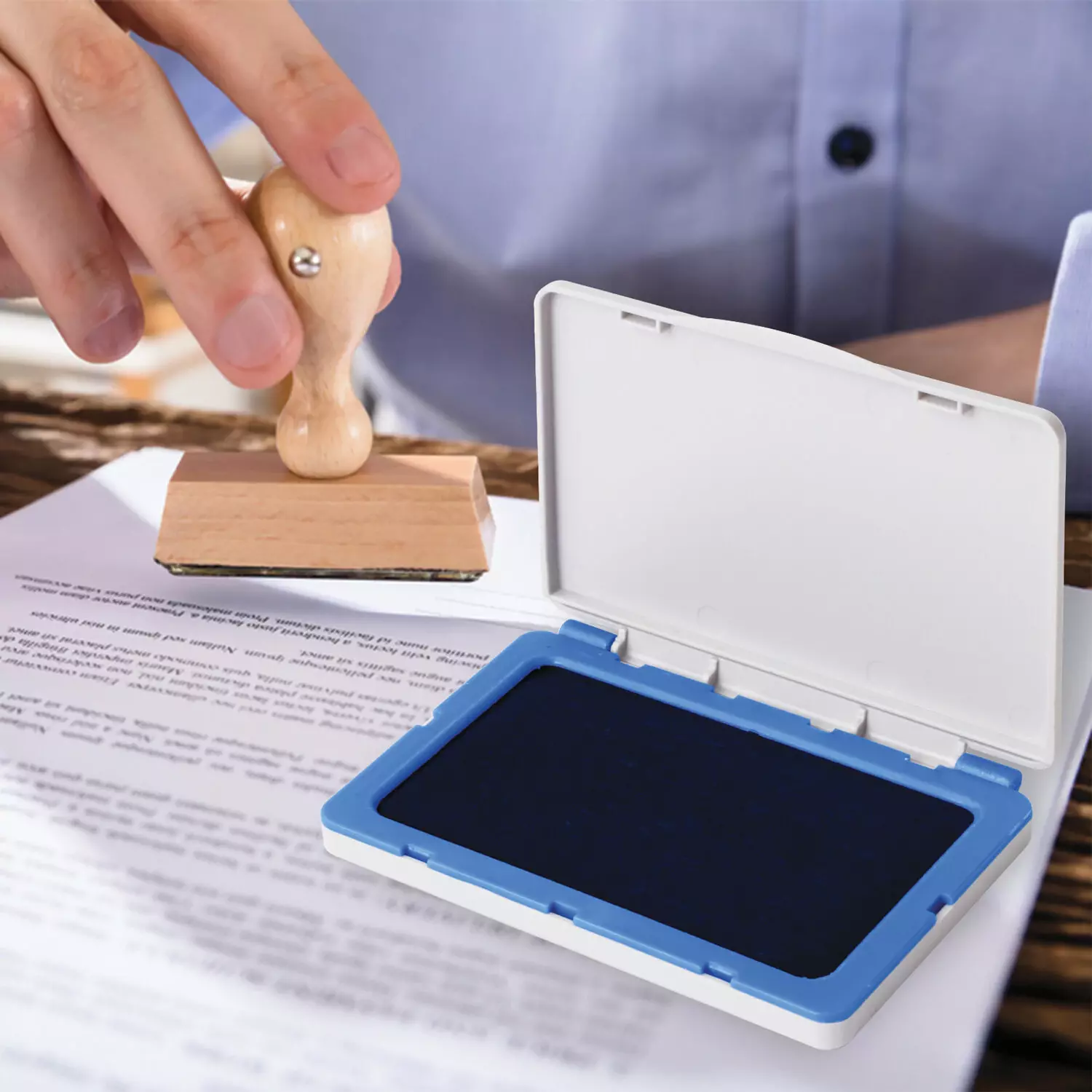 Высококачественные чернила на водной основе. Штемпельная подушка заправлена синей краской. Крышка пластикового корпуса коробочки закрывается плотно, препятствуя испарению влаги. Размер - 100×80 мм, рабочая поверхность - 90×50 мм.